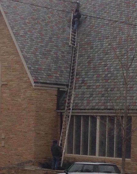 Sent in halfway through December, just before the end of the competition, the highest voted picture involves two workmen showing some misplaced faith while trying to climb a church roof. One man on the ground holds up one ladder which props up a second one leaning against it at an angle. The other worker is halfway up the second ladder, with only the steep church roof to lean into.