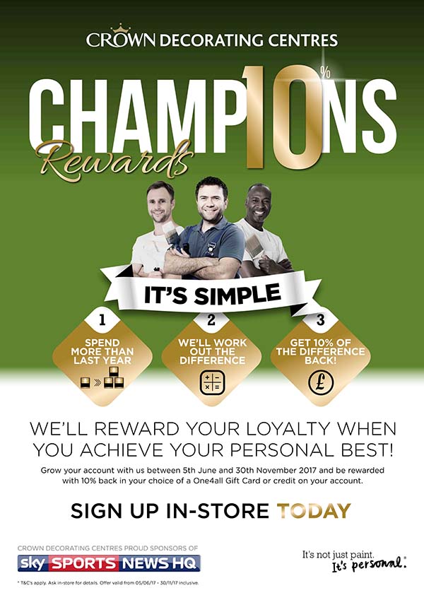 Crown Decorating Centres popular Champions Rewards loyalty scheme kicked off on Monday June 5th. Available in all of the 122 UK-wide stores it gives painting professionals the opportunity to earn the bonuses while stocking up on essentials from June, right through to the end of November.