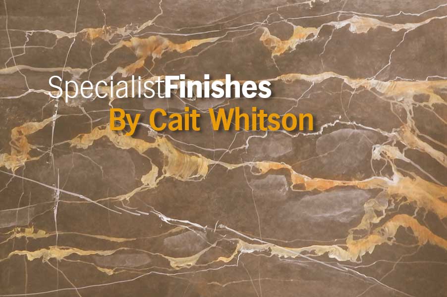 I use a synthetic spalter for this stage but you could use a veinette or overgrainer. Mix a little Paynes Grey and Raw Umber with the Matt Medium, separate the bristles with a brush comb. Draw across the veins to give them depth and texture, this should be thin and soft, wipe away excess from the sides of the veins. Leave to dry. Do the same again with Burnt Sienna adding a little Burnt Umber or Yellow Ochre as you go. Once dry apply a wash of Vandyke Brown. There are pretty, soft white blobs in the background of this marble that generally fall in the spaces between main veins. These can be painted in at this stage – thin white and matt medium blotted and then softened. A few sharp white veins and some fissure will give dimension. Complete the work with a semi gloss varnish.