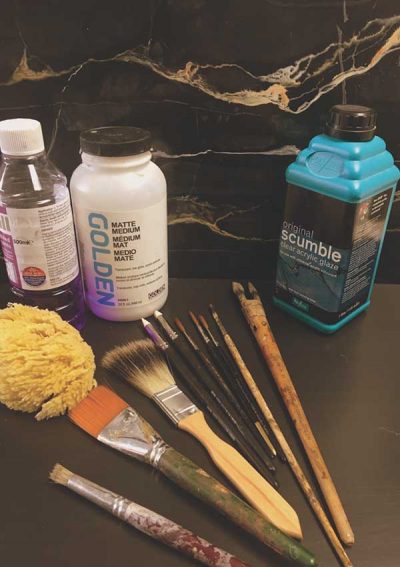 The ground I used was Benjamin Moore Regal Select Pearl Finish in PM-9 Black. I carried out this marble in mainly Matt Medium I thinned it 1:1 with water. Matt Medium allows you to build lots of layers quickly. Drying in about 20 minutes, it is very commercial especially for small projects.