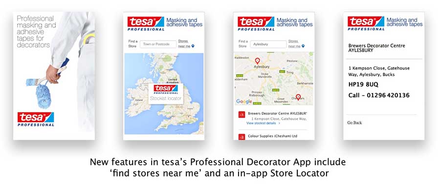 Tesa manufacturers of masking tapes for the decorator, has enhanced its Professional Decorator App. New additions include an in-app Store Locator showing the locations of tesa distributors and outlets and a ‘find stores near me’ feature which uses the geolocation of the user’s device to display stockists within easy reach.