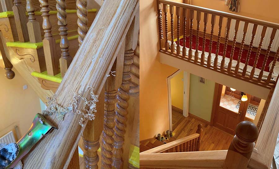 One such job was a large house in Co. Louth. The new owners moved home from USA and wanted the staircase and bannisters changed from Oak to a warm walnut colour instead.