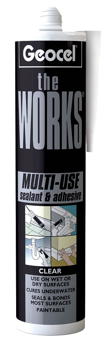 Geocel The Works Multi Use Sealant and Adhesive is for use in areas such as kitchens and bathrooms. Suitable in wet or dry conditions, it is will not shrink or stain and can be used on virtually any substrate.
